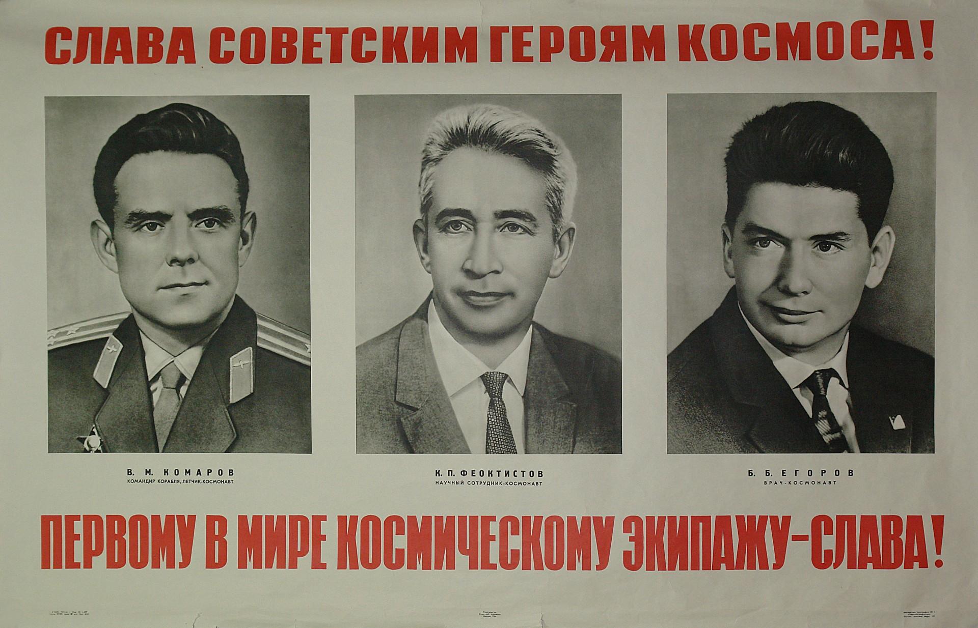12 октября 1964 года на околоземную орбиту был выведен корабль-спутник «Восход». На борту космического корабля находился экипаж в составе командира корабля, лётчика-космонавта Владимира Михайловича Комарова, научного сотрудника-космонавта Константина Петровича Феоктистова и врача-космонавта Бориса Борисовича Егорова. Впервые в истории космонавтики был запущен многоместный космический корабль, впервые в мире на орбите работал не один человек, а коллектив исследователей.