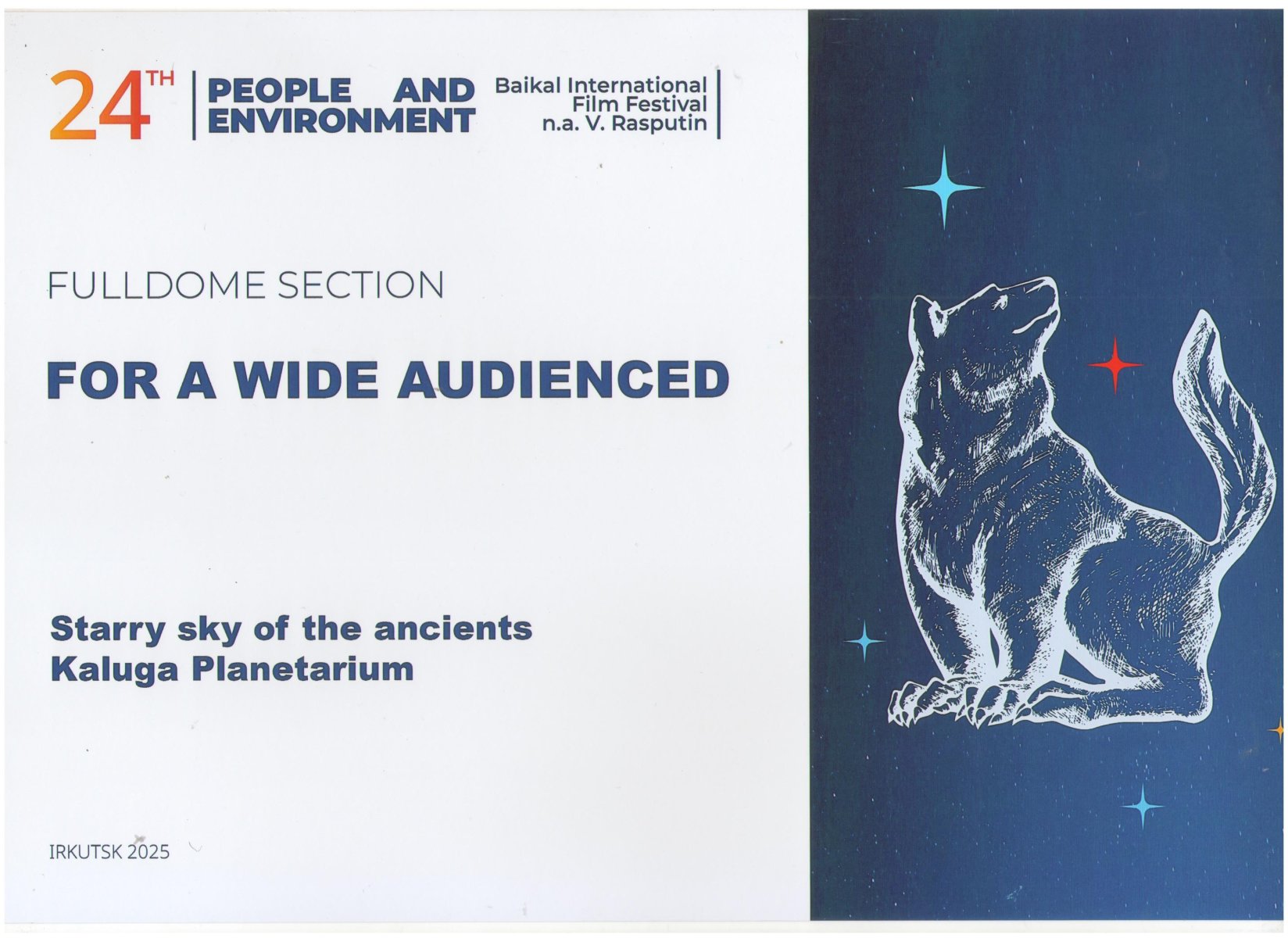 С 22 по 30 сентября 2025 года в Иркутске прошёл 24-ый Байкальский международный кинофестиваль «Человек и природа» имени В.Г. Распутина. В рамках фестиваля работала и полнокупольная секция, на которой в этом году в планетариях Иркутска было показано 8 полнокупольных фильмов из Австралии, Уругвая, ЮАР и России.