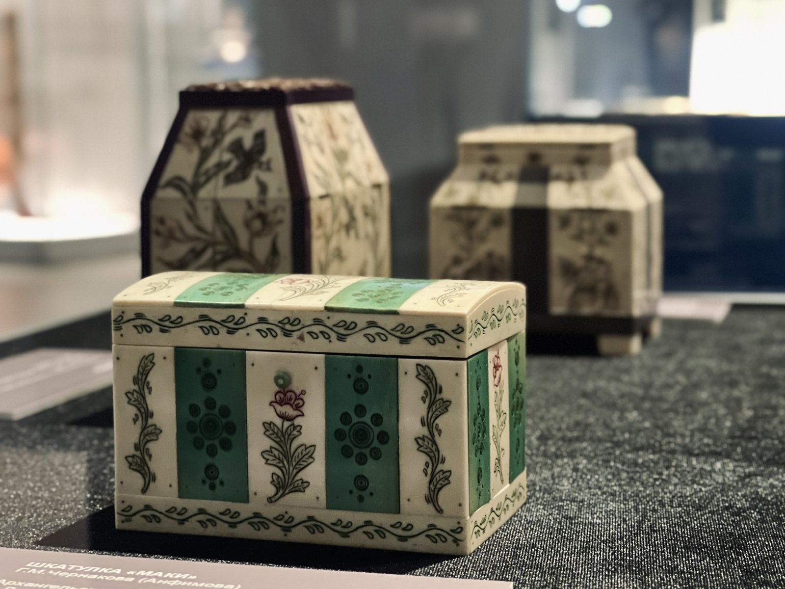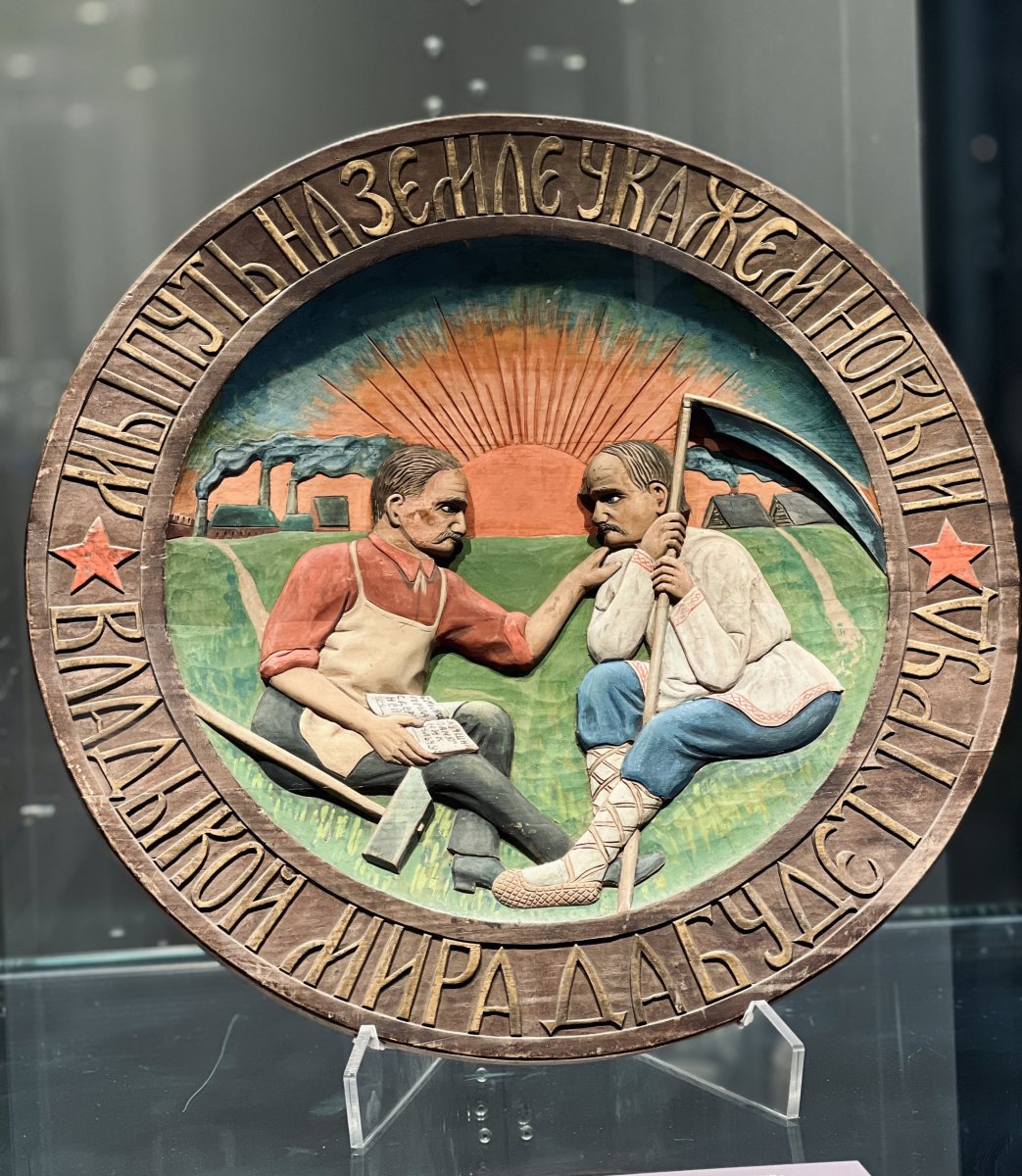 Впервые на выставке в музее истории космонавтики экспонируются триптих ручного ткачества художника Галины Орловой «Пусть всегда будет Солнце!», чайница, ларец и шкатулка – произведения костяного искусства Архангельской области, уникальное блюдо «Владыкой мира будет труд» неизвестного автора из фондов Всероссийского музея декоративно-прикладного и народного искусства.