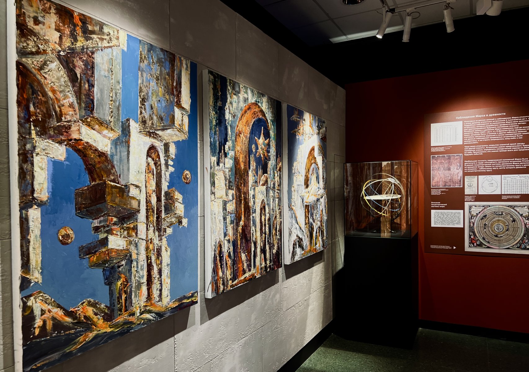 Перед посетителями предстанут копии старинных гравюр с изображением Марса, фотографии, рисунки, книги о Красной планете, марсианские карты, триптих Анны Быковой «Космические города» и многое другое.