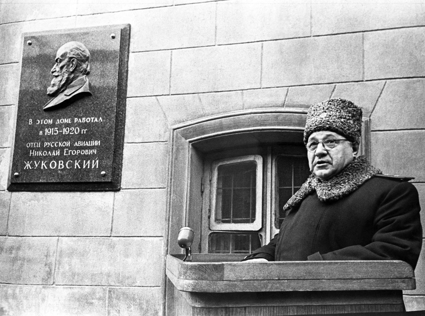 Открытие мемориальной доски, посвящённой профессору Н.Е. Жуковскому, А.Н. Туполевым, 1958 г.