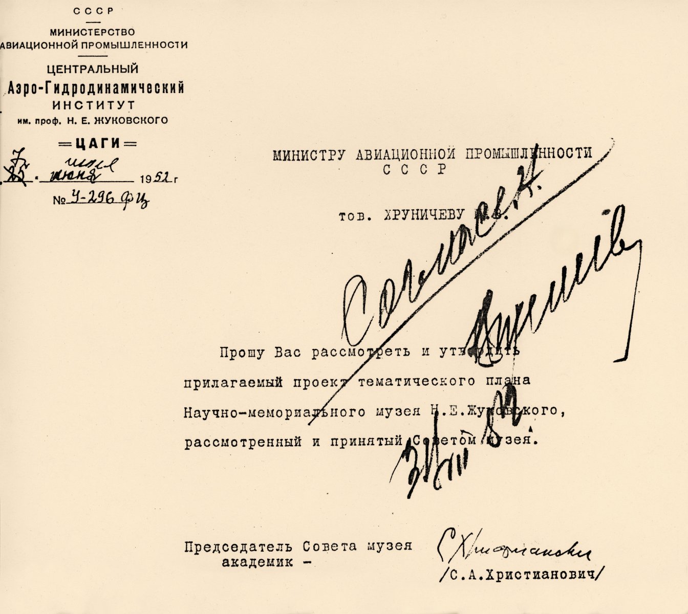 Докладная записка председателя Совета музея академика С.А. Христиановича министру авиационной промышленности М.В. Хруничеву о рассмотрении и утверждении проекта первого тематического плана музея, 1952 г.