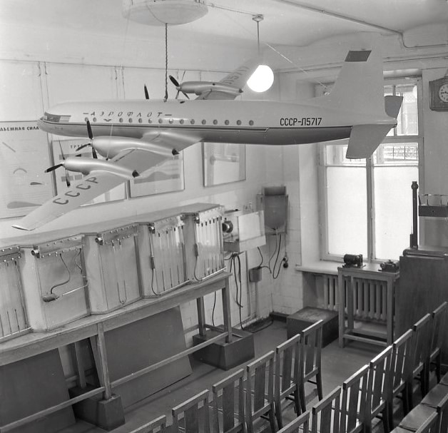 Общий вид физического кабинета. На переднем плане подвесной макет пассажирского самолета Ил-18, 1974 г.