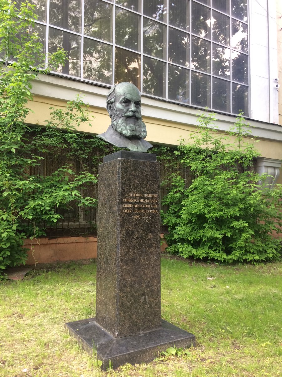 Памятник Н. Е. Жуковскому работы скульптора Г. В. Нероды и архитектора И. А. Француза, установленный в 1958 году. На гранитном постаменте высечены слова профессора: «Человек полетит, опираясь не на силу своих мускулов, а на силу своего разума», 2022 г.