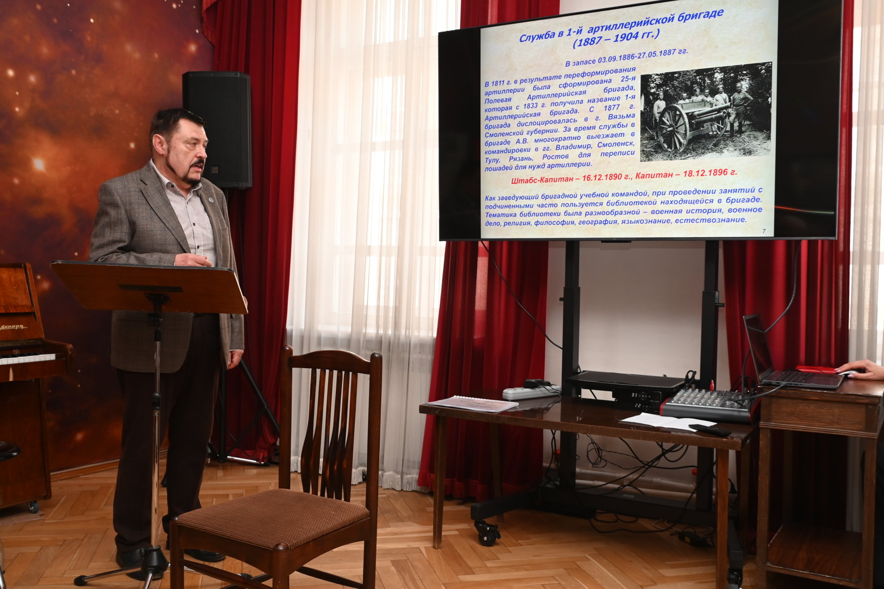 В актовом зале музея прозвучал доклад главного эксперта Научно-исследовательского и конструкторского института энерготехники им. Н.А. Доллежаля Госкорпорации «Росатом» Александра Арефьева «Вспоминая героев забытой войны (посвящается полковнику Аркадию Васильевичу Чижевскому, дяде А.Л. Чижевского, и моему прадеду, и полковнику Василию Васильевичу Арефьеву, моему деду)». Доктор исторических наук, профессор кафедры истории КГУ им. К.Э. Циолковского Ирина Белова рассказала о роли российской провинции во время Первой мировой войны.