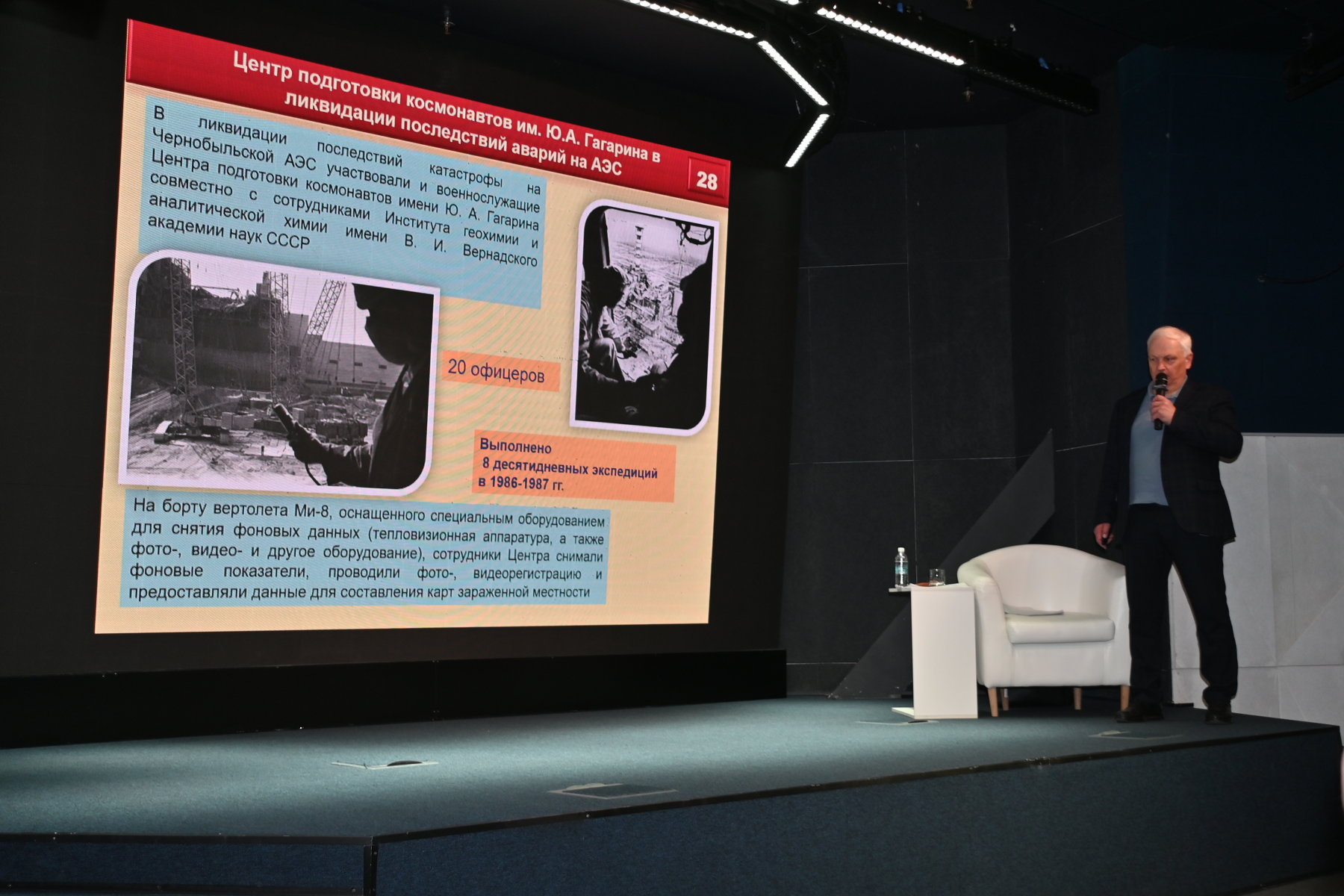 22 апреля 2026 года встречу «Уроки Чернобыля» провёл Вячеслав Каркашадзе — директор Научно-мемориального музея профессора Н.Е. Жуковского (филиал ГМИК им. К.Э. Циолковского в Москве) и непосредственный участник ликвидации аварии на Чернобыльской АЭС. Вячеслав Гамлетович восстановил хронологию событий ночи 26 апреля 1986 года, подробно разобрал устройство реактора РБМК-1000 и причины, приведшие к разрушению активной зоны. Слушатели узнали о ходе эвакуации населения из Припяти, организации дезактивационных работ, о роли Вооружённых сил и специалистов Центра подготовки космонавтов в ликвидации последствий аварии. О роботах, работавших на ликвидации последствий аварии, рассказал в своем видеовыступлении советник директора-главного конструктора Санкт-Петербургского центрального научно-исследовательского института робототехники и технической кибернетики Александр Железняков. Завершилась встреча личными воспоминаниями Вячеслава Каркашадзе о работе в зоне отчуждения.
