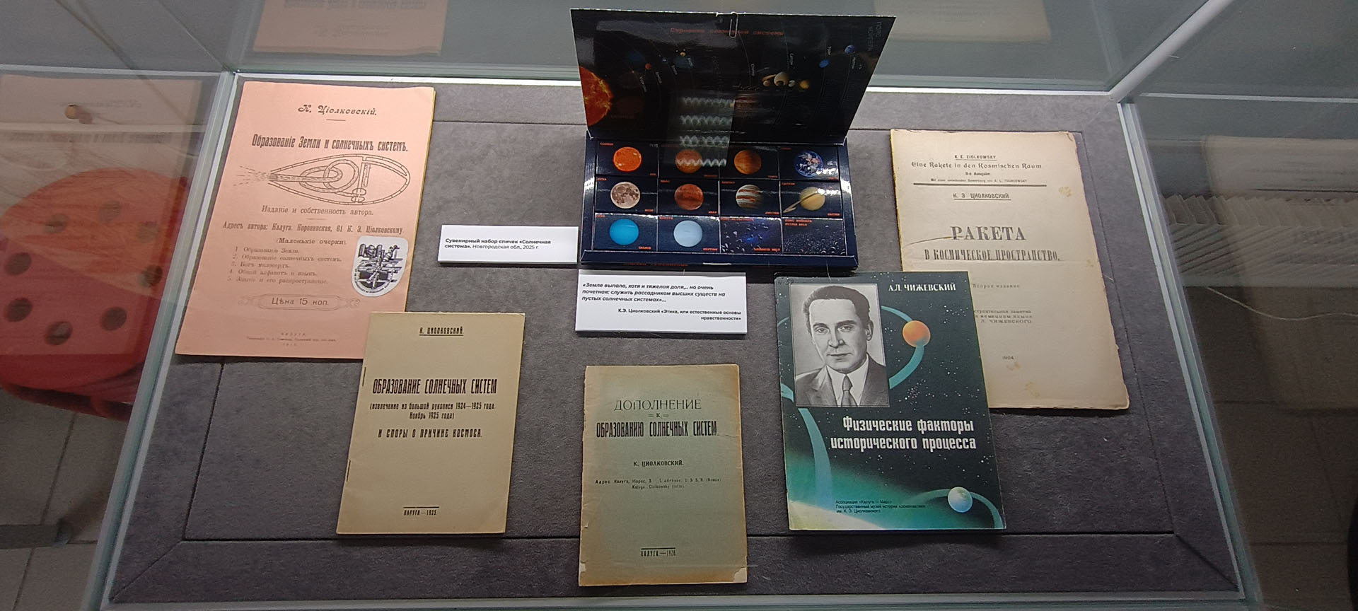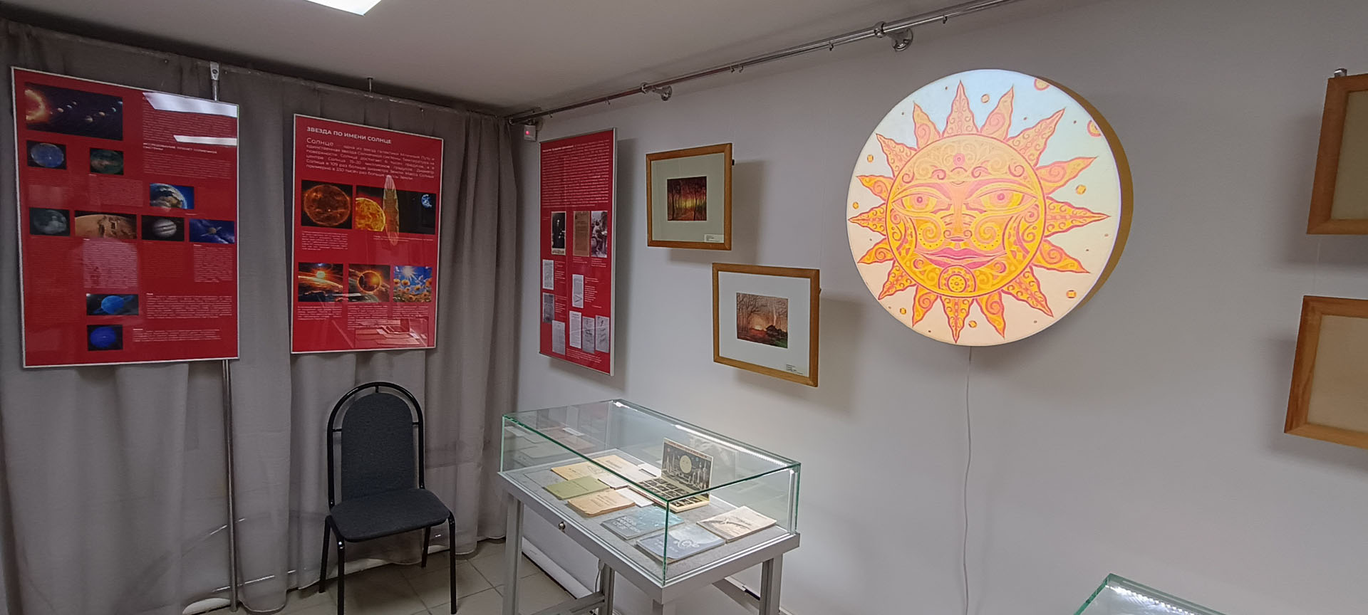 На выставке представлены прижизненные издания научных трудов К.Э. Циолковского, связанные с Солнцем, научные публикации о Солнце и акварельные рисунки А.Л. Чижевского. Здесь можно видеть штурманский звёздный глобус и модель китайского самоходного аппарата, предназначенного для исследования Луны, а также рисунки с изображением Солнца в представлении древних народов, снимки Солнца из космоса, выполненные с помощью космической техники.